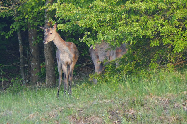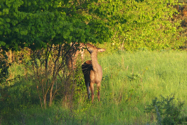 Podchodzę do miejsca, skąd widać staw, gdy kątem oka dostrzegam moje jelenie. Przeszły zakrzaczonym wąwozem po drugiej stronie kemu, wspięły się na łąkę, podeszły do grądu zasłaniającego domostwa Pokrzyw. Zaczęły się paść. Stoję w cieniu łęgu za plecami. Przede mną przydrożne dębczaki, olchy, krzaki łozy… Jeszcze nie pokryły się dojrzałym listowiem, lecz dają osłonę. Znajduję miejsca, skąd między gałązkami fotografuję zwierzęta.